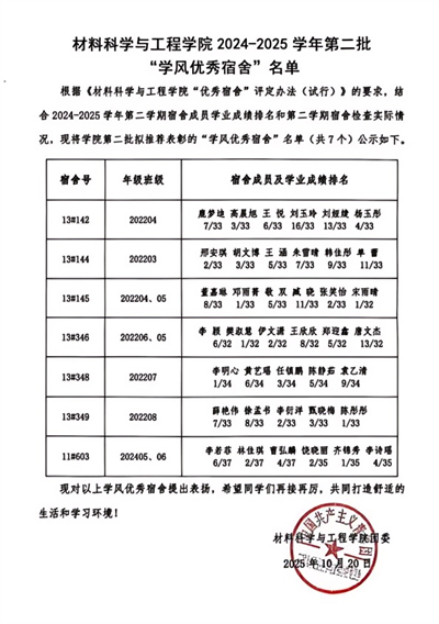 (三)育舍风。始终将舍风营造作为关键抓手,定期评比学风优秀宿舍。学院通过建立完善的激励机制,对学业成绩优秀的先进宿舍集体予以公开表彰及线上宣传,配套发放学习用品奖励,并为宿舍成员在综合测评中予以适当加分,以点带面,充分发挥先进宿舍集体的示范作用,有效形成了“先进带后进、集体促个人”的良性互动格局。