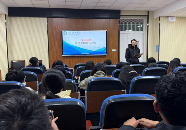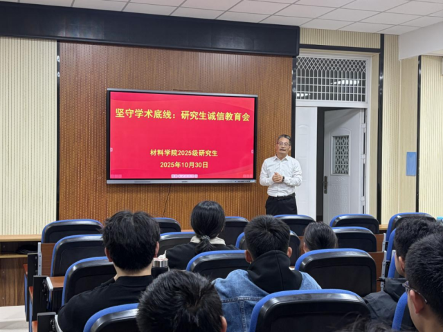 (一)进一步强化研究生的学术规范意识,营造风清气正的学术生态。2025年10月,学院组织开展“坚守学术底线——研究生诚信教育会”活动,特邀倪俊杰教授担任主讲嘉宾,学院全体2025级研究生参会。活动有助于加强研究生学术道德建设,引导广大学生以敬畏之心对待学术研究,以诚信之力支撑学术追求,有效助力学院学风建设工作稳步推进。