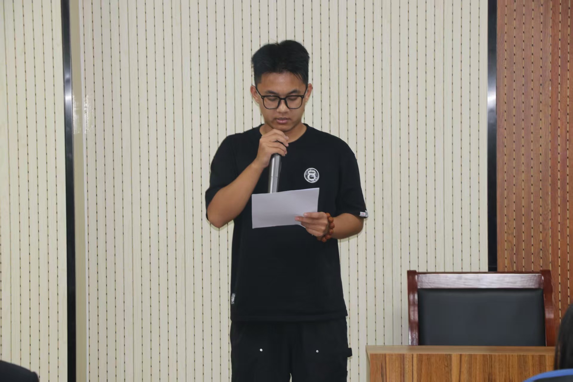 新一任学生会主席团成员代表邓新瑶作表态发言,她立足岗位承诺将以务实行动服务同学、推动学生组织工作提质增效,展现出新一届学生骨干的担当与决心。