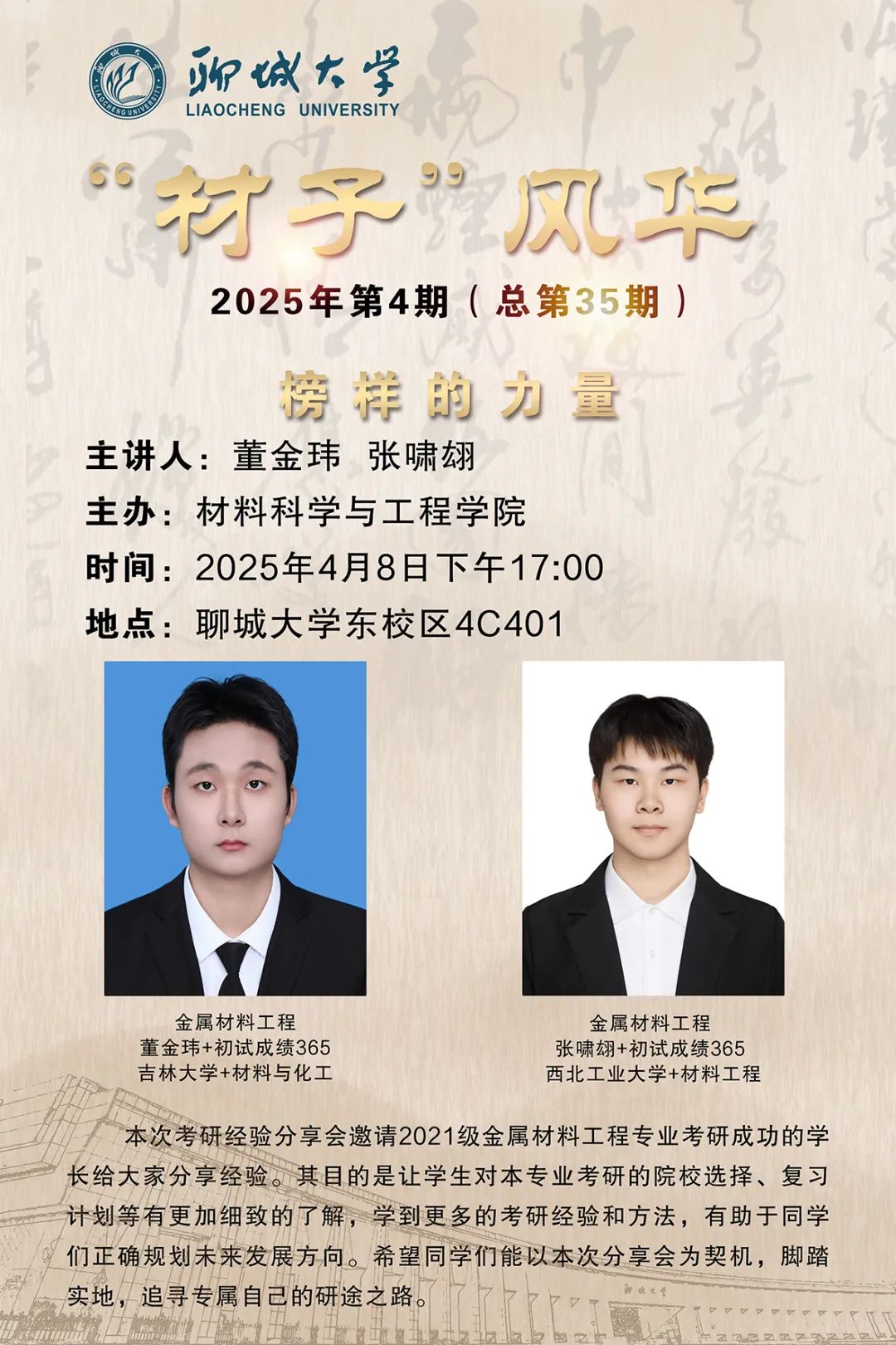 为加强学院学风建设,促进学术交流与人才培养,助力材料学子科学规划考研路径,2025年4月8日,英国365集团于东校区4#C401开展金属材料工程专业考研经验分享交流会。本次交流会特邀2021级金属材料工程专业优秀考研学子董金玮、张啸翃担任主讲嘉宾,2022级金属材料工程专业全体同学参加。