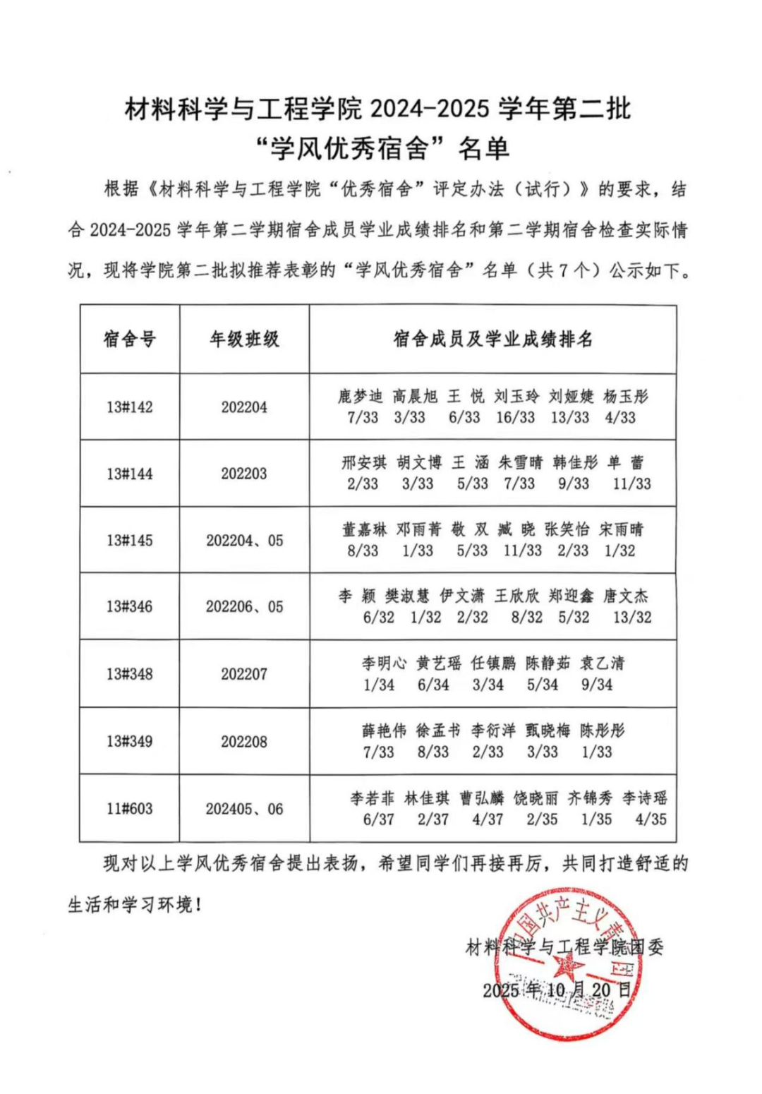 本次“学风优秀宿舍”评选活动是根据《英国365集团“学风优秀宿舍”评定办法(试行)》的要求,结合2024-2025学年第二学期的宿舍检查实际情况及第二学期宿舍学业成绩排名,现将学院第二批拟推荐表彰的“学风优秀宿舍”名单(共7个)公示如下:13#142、13#144、13#145、13#346、13#348、13#349、11#603宿舍。学院为以上“学风优秀宿舍”发放学习用品奖励,并为宿舍成员在综合测评中予以适当加分。